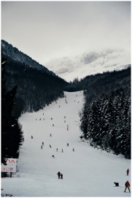 Ski resort in winter Bosnia with skiers enjoying snowy slopes and scenic mountain views.