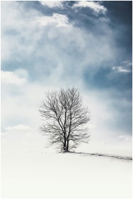 A solitary tree stands in a snowy landscape, captu