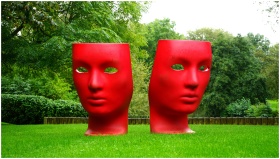 Vivid red mask sculptures in a lush green park setting in Warwickshire, England.