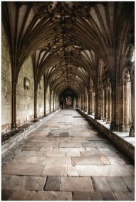 Explore the stunning gothic architecture of an ancient cloister corridor with intricate stone arches.