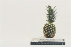 A pineapple resting on two stacked photography books against a plain backdrop.