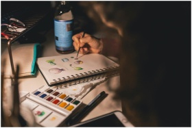 Artist painting with watercolors in a notepad at a
