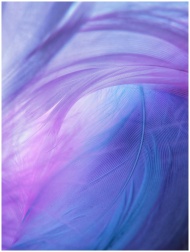 A soft, colorful abstract composition with dreamy pastel hues featuring blue and purple feather textures.