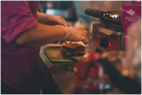 A chef wearing gloves prepares a sandwich indoors with professional equipment.