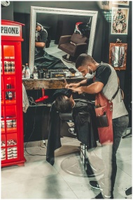 Barber performing a haircut in a stylish barbersho