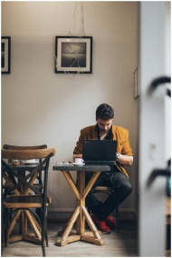A man wearing a jacket is focused on his laptop in a cozy café interior.