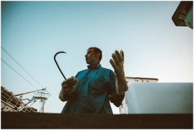 Fisherman repairs a net under a boat in Damietta,