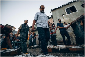 Urban street scene with graffiti-covered newsstand