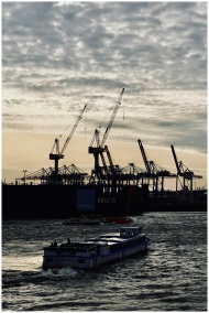 A cargo ship passes a busy industrial port with cranes silhouetted against a sunset sky.