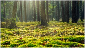 A serene forest view in Wielbark, Poland with sunl