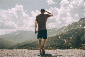 A man enjoys mountain hiking with stunning views of peaks and clouds.