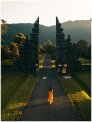 Aerial view of a woman in orange dress walking towards Bali Handara Gate at sunrise in Indonesia.