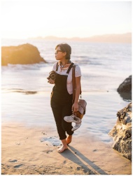 Young woman holding a camera and shoes strolling on the beach at sunset.