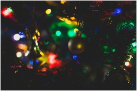Close-up of colorful Christmas lights and ornaments creating a festive atmosphere.