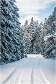 A serene snow-covered path through a winter forest, surrounded by frosty conifer trees.