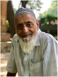 Portrait of an elderly vendor sitting by a colorfu