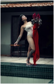 A woman standing by a pool holding flowers, striking an artistic pose.