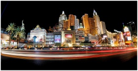 Illuminated cityscape of the Las Vegas Strip featu