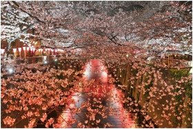 Beautiful cherry blossoms glowing under lights at night along a canal in Tokyo, Japan.