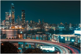 A stunning night view of New York City's skyline with illuminated skyscrapers and a bustling highway.