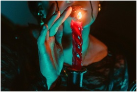 An atmospheric portrait featuring a person and a lit candle, casting shadows and a gothic vibe.