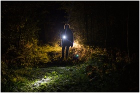 A lone woman with a flashlight illuminates a dark forest path, creating a mysterious nighttime scene.