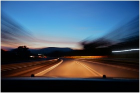 Blurred highway scene with car lights at twilight, showcasing motion and speed.