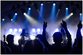 Silhouetted audience enjoying a live band performance with dramatic lighting at night.