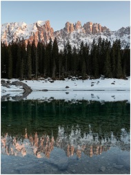 Serene winter landscape of conifer forest reflecting on a tranquil lake in Trentino, Italy.