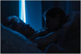 A romantic moment of two men sleeping closely together under soft blue lighting, conveying warmth and affection.