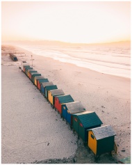 Aerial view of colorful beach huts on a serene winter coastline during sunset.