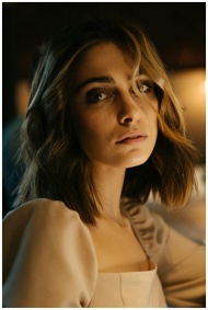 Portrait of an elegant woman sitting at a bar counter with a thoughtful expression in dim lighting.