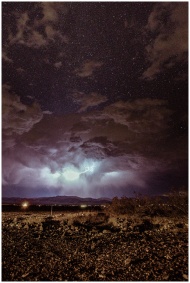 Stunning night image capturing a thunderstorm under a starry sky, showcasing dramatic lightning and cloud formations over a desert landscape.