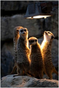 A group of meerkats stands under a warm light on rocks, exhibiting curiosity.