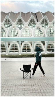 A person walks past a modern architectural building with an empty chair in front.
