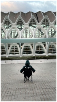 A person sits in front of a futuristic building, r