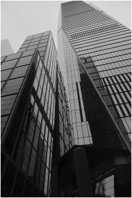 Black and white photo capturing towering skyscrape