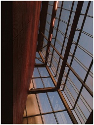 Low-angle view of a modern building interior showcasing skylight windows and architectural design.