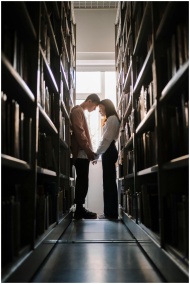 A couple shares a tender moment holding hands between library bookshelves.