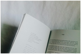 Open book with text on white surface, minimalist a