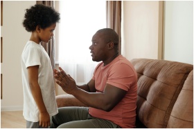 A father and son sharing an intimate conversation in a cozy living room setting.