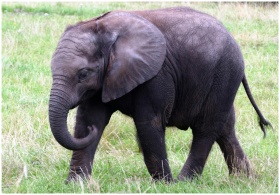 A young African elephant walking through grasslands, showcasing its majestic trunk and large ears.