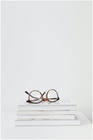 Minimalist image of round eyeglasses atop a stack of white books with ample copy space.