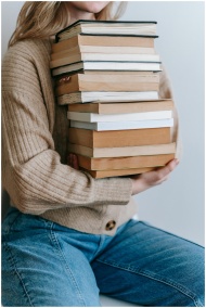 Crop unrecognizable female student in casual clothes holding stack of books against light wall in daytime