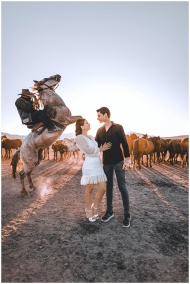 A couple embraces in a rural field with horses under a dramatic sunset sky.