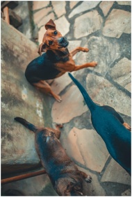 Three dogs on a stone patio looking up at the came