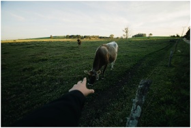Hand reaching towards cow in a picturesque farm field during sunset, capturing serene rural life.