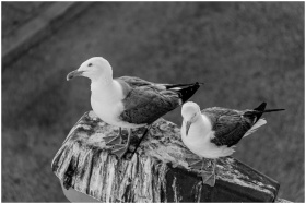 Black and white photo capturing two seagulls perched, with a focus on their plumage and beaks.