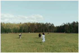 A young girl runs through a lush green meadow with