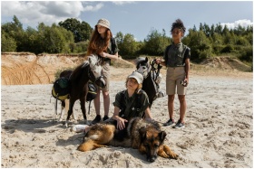 Young explorers with ponies and a dog on a sandy t